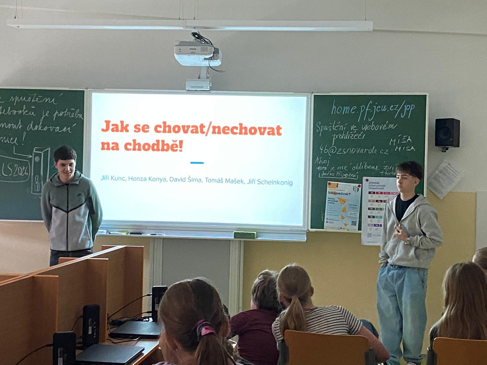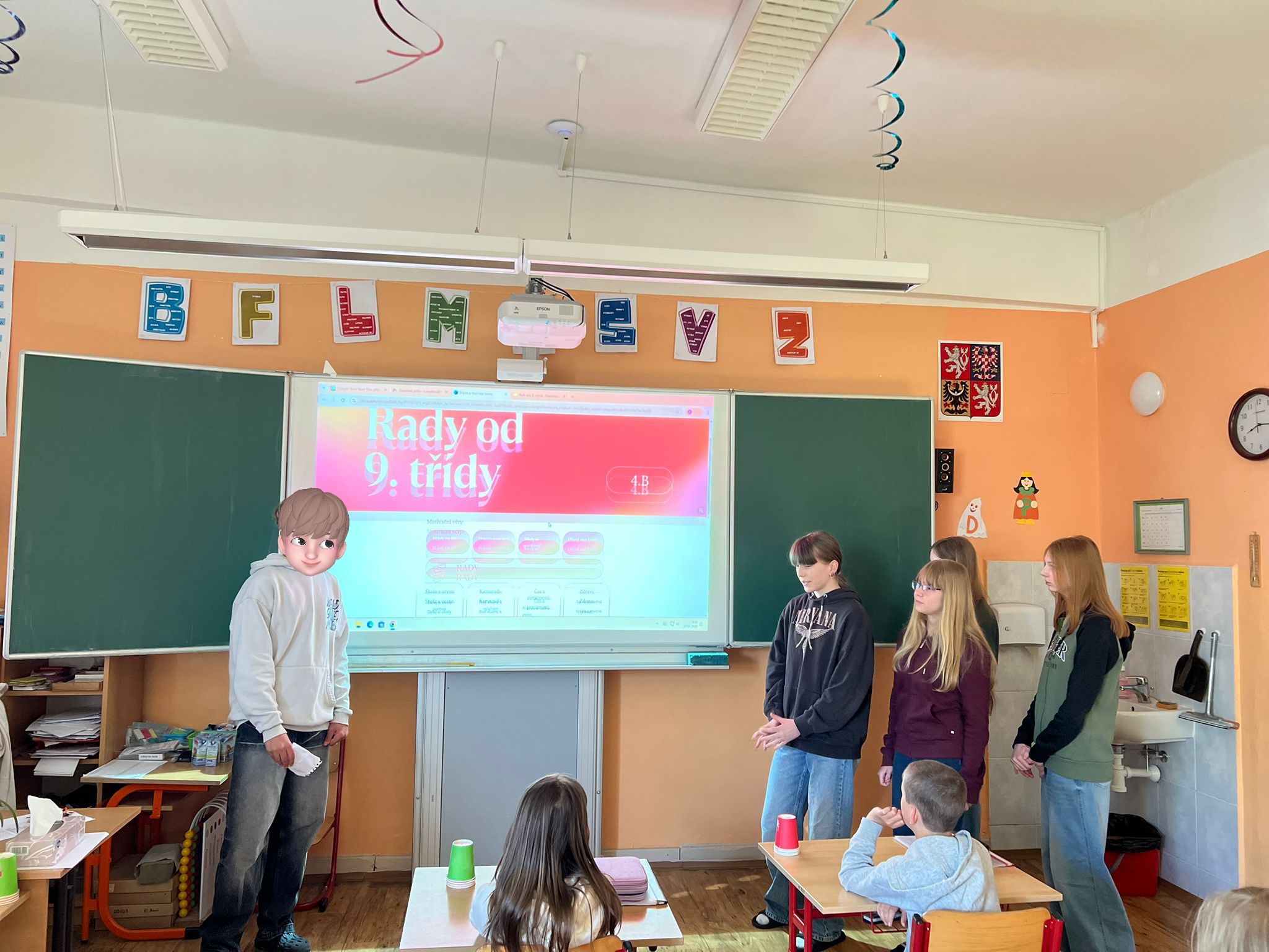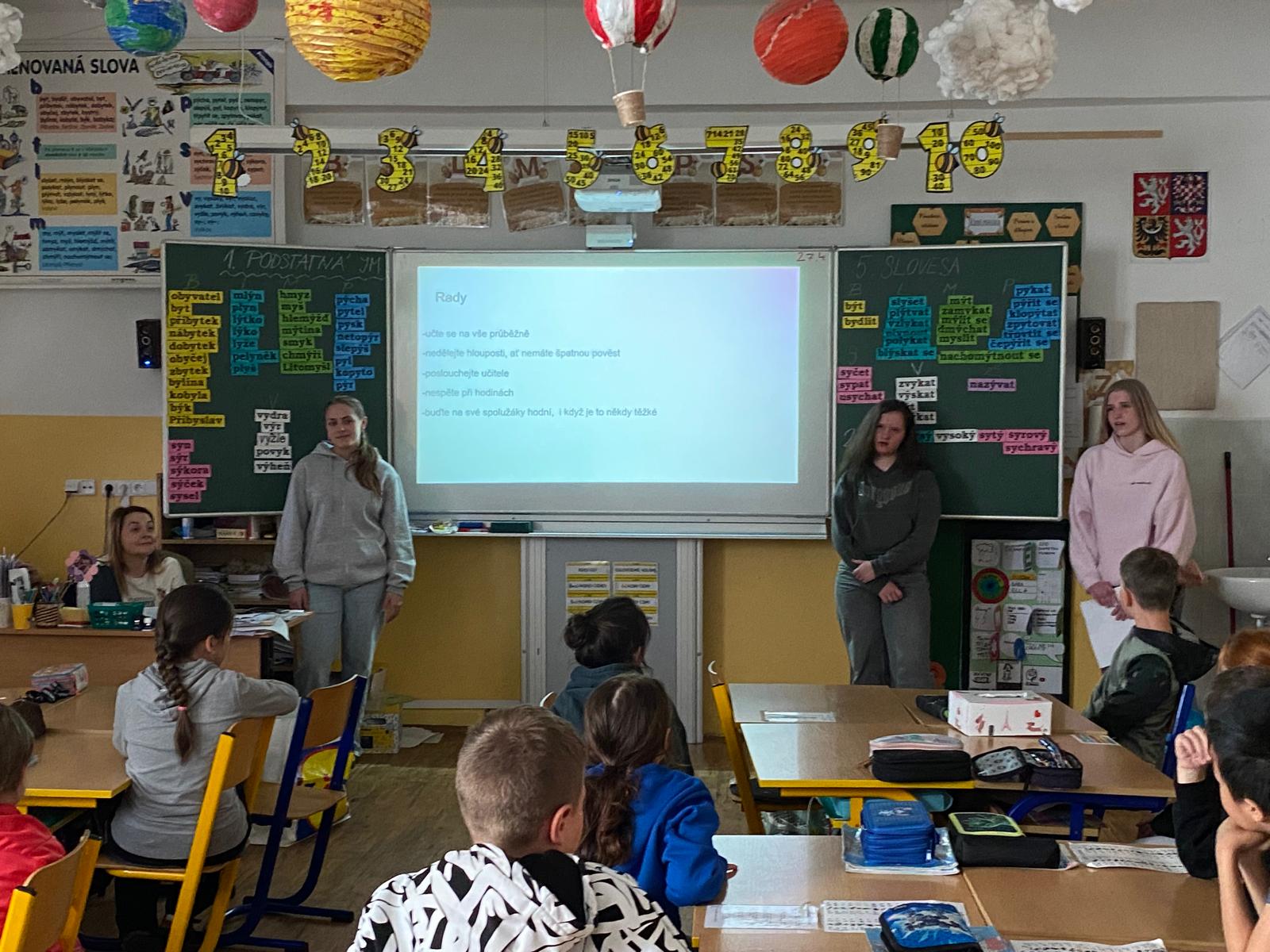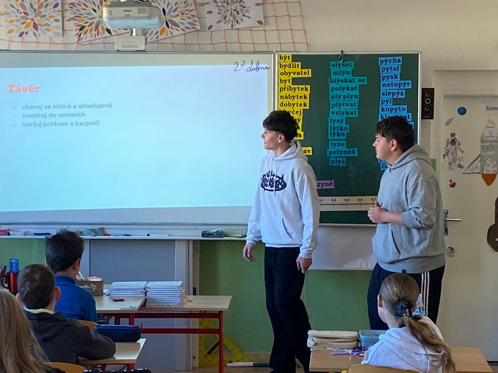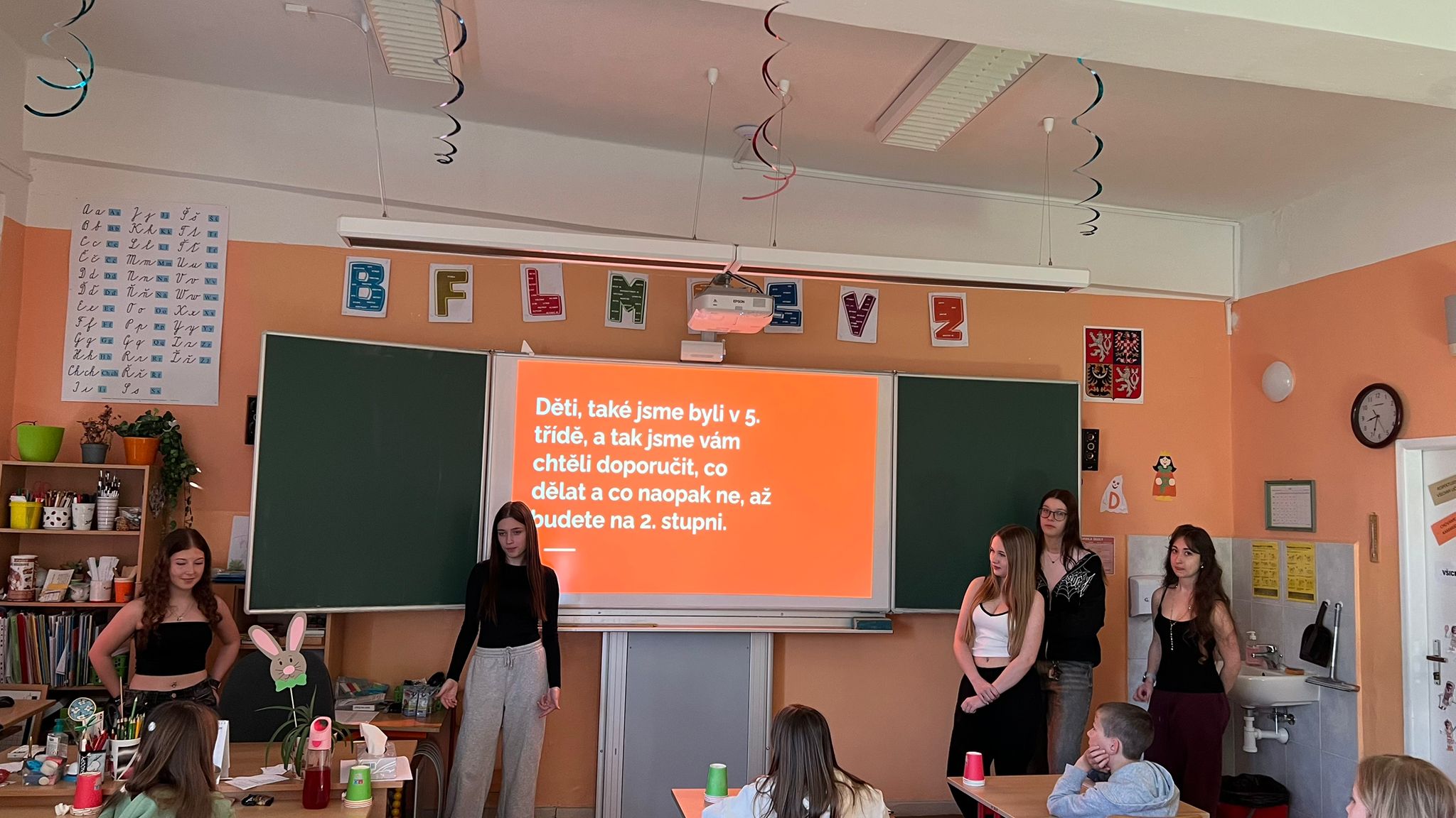 Žáci nejvyššího ročníku si připravili zajímavé prezentace na různá témata a situace, které zažili. Své role se zhostili velmi zodpovědně, rozdělili se do skupin, navštívili své mladší spolužáky přímo v jejich třídách a osobně jim své postřehy přednesli. Pro deváťáky to byla skvělá příležitost vyzkoušet si veřejné vystupování, ale především uvědomit si, že pro děti na prvním stupni jsou právě oni těmi „velkými“, ke kterým se vzhlíží.